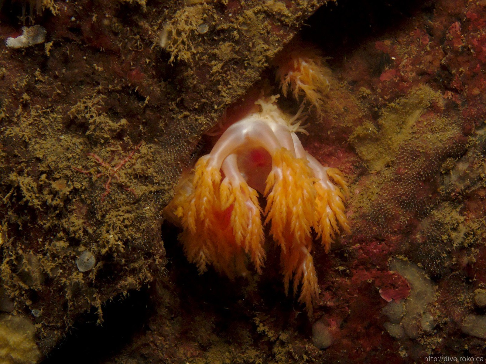 An interesting, unidentified, critter we found is the one on the left. The best suggestion so far is that it’s a Red Sea Cucumber, which tends to hide within crevices and feed with it’s arms/frills. The interesting thing is that Red Sea Cucumbers are typically VERY red, whereas this critter has a white body with orange “frills”. I’m not sure if there is that much colour variation within the species, or if this is a related species of cucumber. If anyone has an answer, let me know!